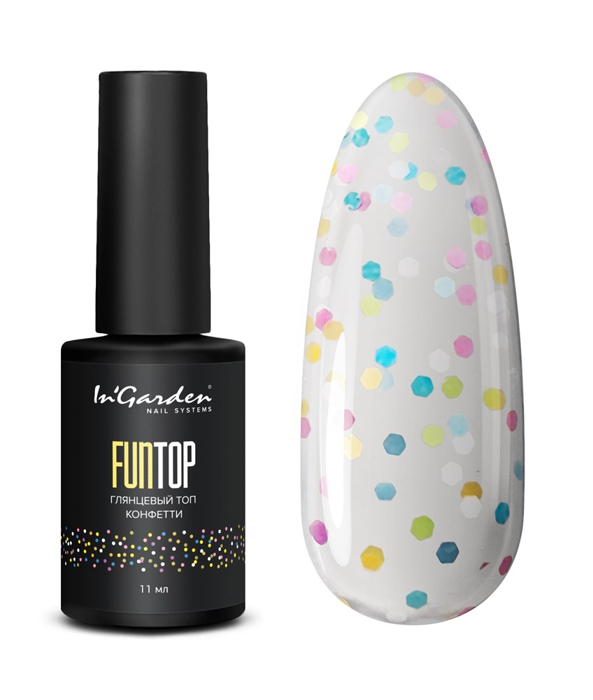 Этот магический топ с разноцветными шестигранниками превратит обыденный маникюр в настоящий праздник цвета. Частицы представлены в белом, желтом, розовом, синем цвете, нежно-зеленом и голубом оттенках металлика и напоминают новогодние краски.